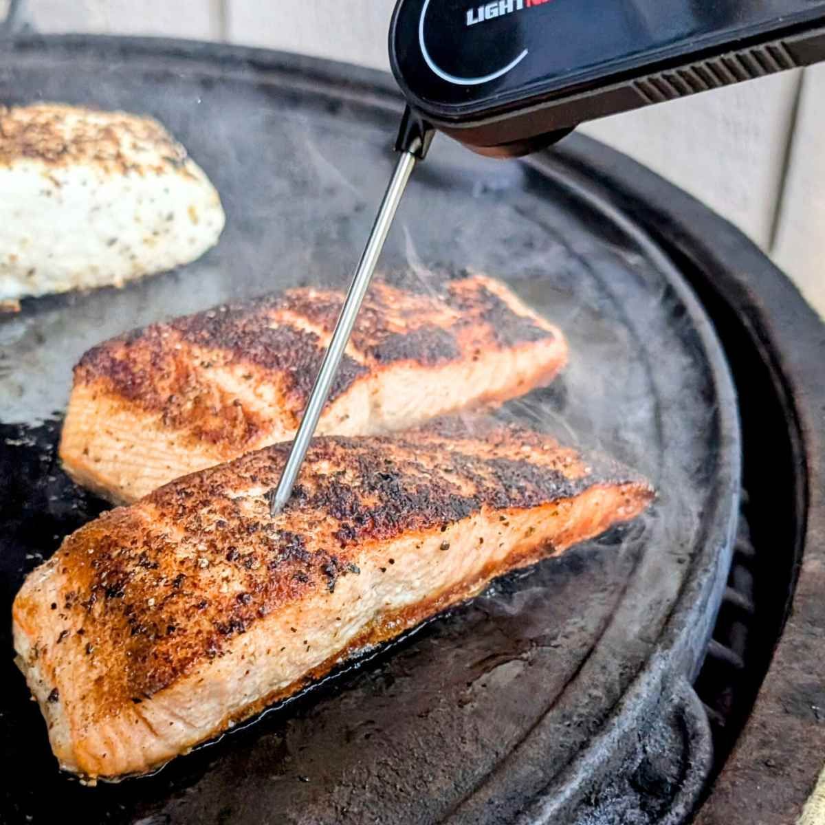 Step 5: Remove the salmon the grill, and immediately top with 1 tablespoon of the herb butter. Let rest for 2–3 minutes before serving – the salmon will continue to cook slightly as it rests, and the butter will start to melt.